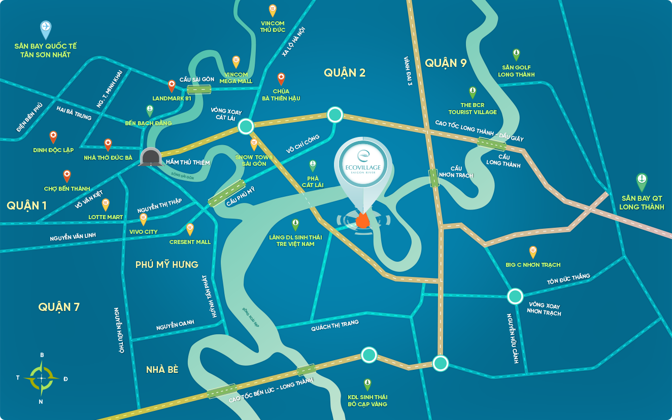 Vị trí EcoVillage Saigon River: Nhơn Trạch – Đồng Nai (Qua phà Cát Lái 3km, cách trung tâm nhà thờ Đức Bà Hồ Chí Minh 18km).
